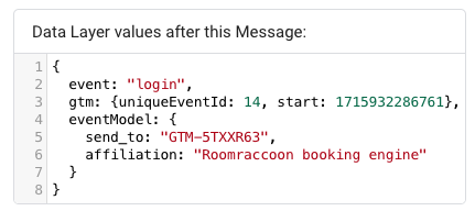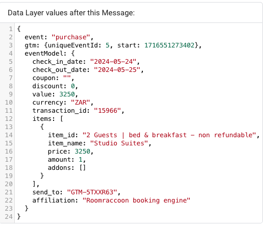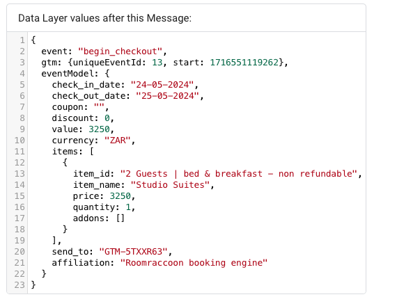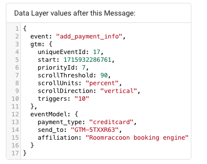 Dieses Ereignis wird ausgelöst, wenn ein Nutzer ein Zimmer auswählt und es zum Warenkorb hinzufügt. Die Struktur der Datenschicht sieht so aus:
