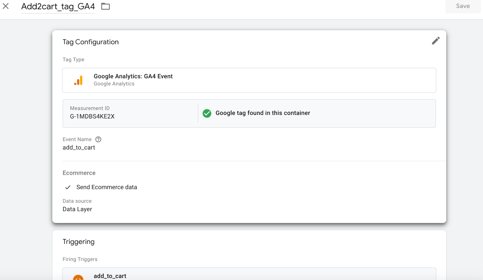 Erstelle dann die Trigger für jedes Ereignis in GTM und löse ein GA4-Ereignis-Tag für jedes Ereignis aus, mit ausgewählten E-Commerce-Daten: