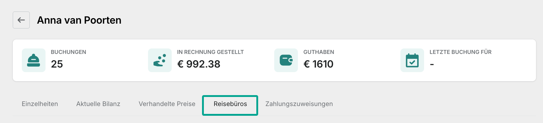 Der Tab Reisebüros im Bucherprofil ermöglicht es dir, ganz einfach Reisebüro-Unterprofile zu erstellen und zu verwalten, die mit einem Hauptbucher- oder Firmenprofil verknüpft sind.