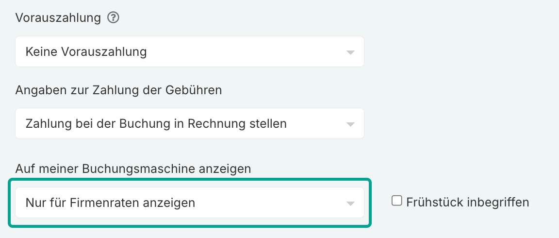 Wähle im Dropdown In der Buchungsmaschine anzeigen die Option: Nur für Firmenvereinbarungen anzeigen
