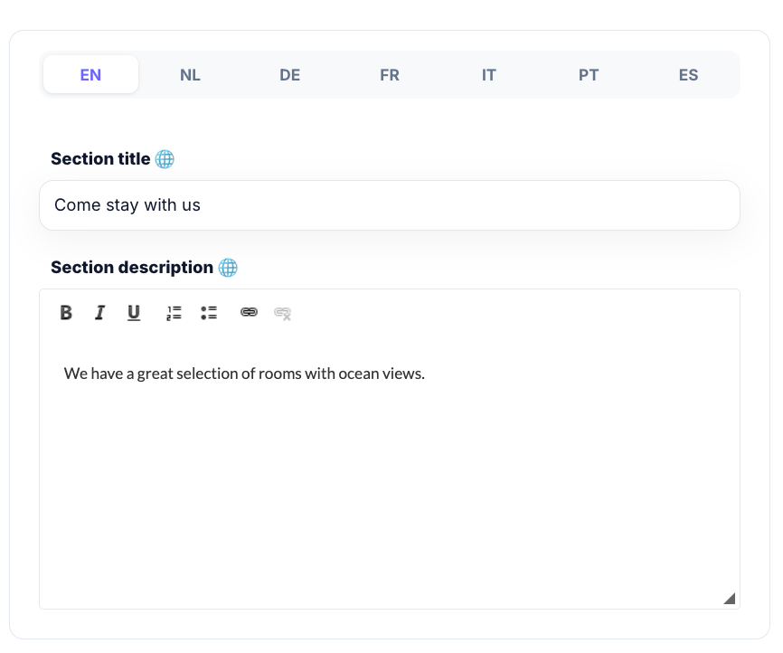 • Textblock: Füge individuellen Text hinzu, um deine Geschichte zu erzählen, Gäste willkommen zu heißen oder wichtige Informationen über deine Unterkunft bereitzustellen.