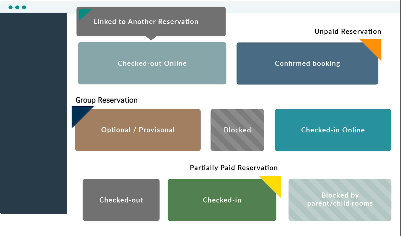 Green: Checked in. When you have checked in a guest, the reservation status should be changed from “booked” to “checked in.”