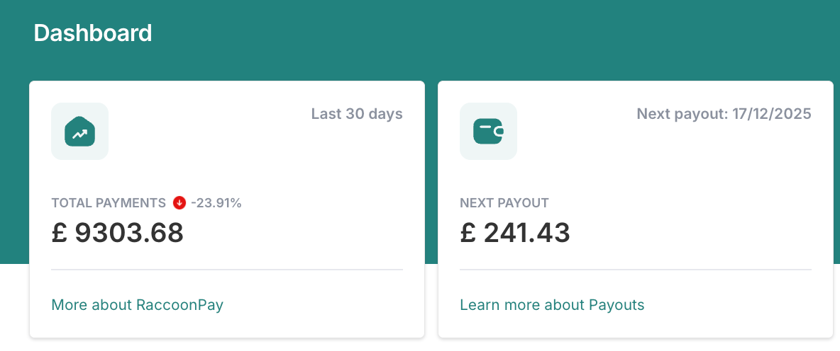 In the RaccoonPay Dashboard, you can find all information about Payouts in the Next Payout card.