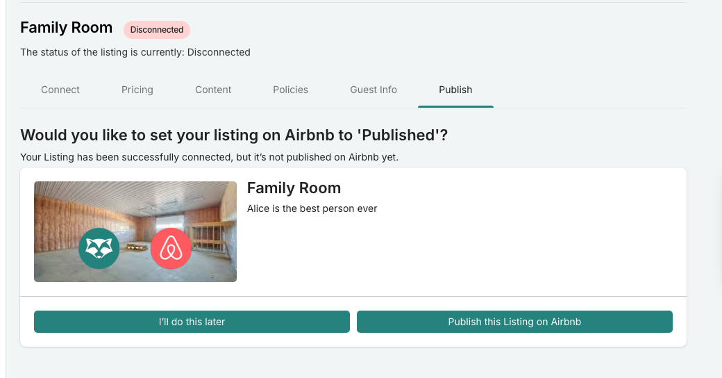 Because RoomRaccoon is only synchronising rates and availability to Airbnb, you will be directed to the publish page where you can complete the connection for that category by clicking on “Publish this listing on Airbnb”: