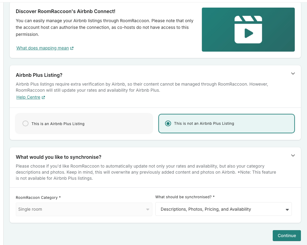 Step 2: You will be directed to the "Connect" tab where you will select the RoomRaccoon category you would like to link to this listing as well as the synchronisation flow you would like to use: