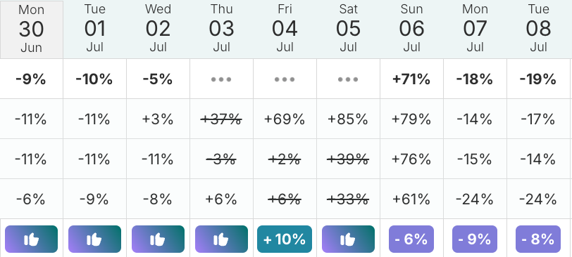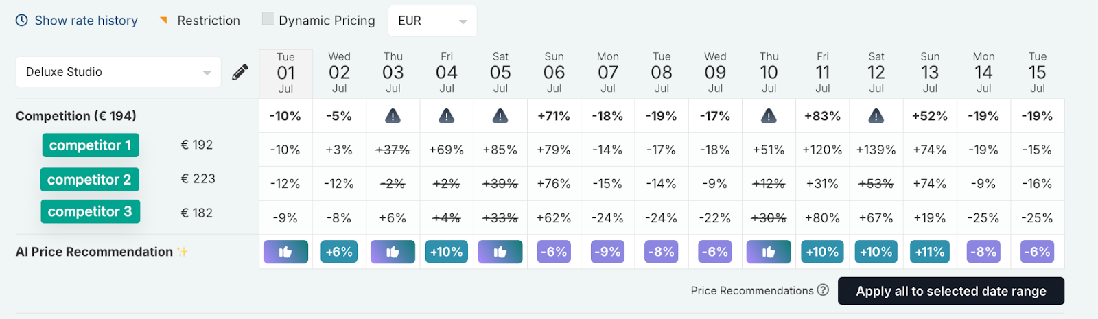 Each date in the calendar displays a rate comparison tile that reflects how your rates compare to your competitors’ BAR (Best Available Rate) pulled from Booking.com’s mobile rates.