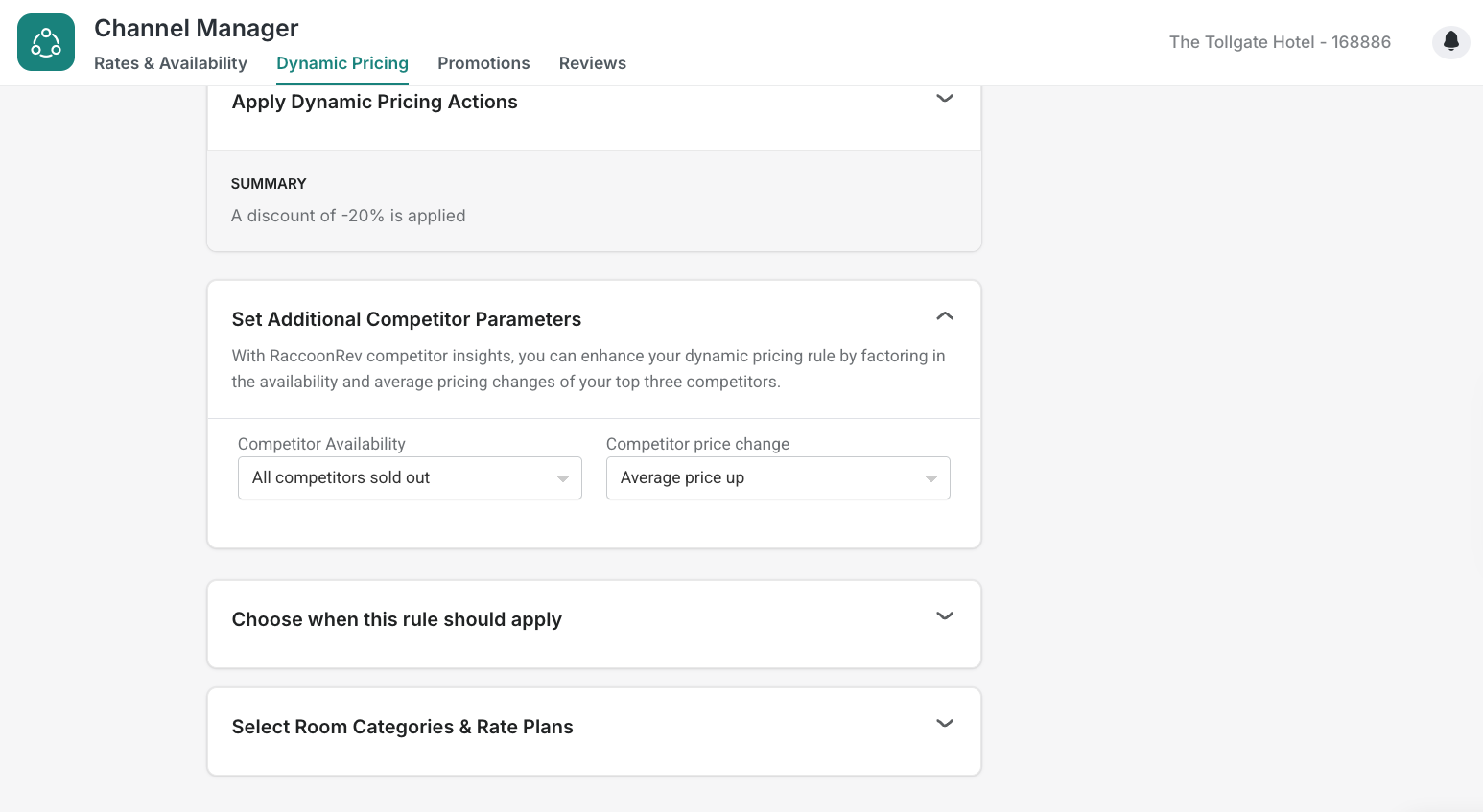 RoomRaccoon’s dynamic pricing engine allows you to set rule-based rate changes based on defined conditions, including: