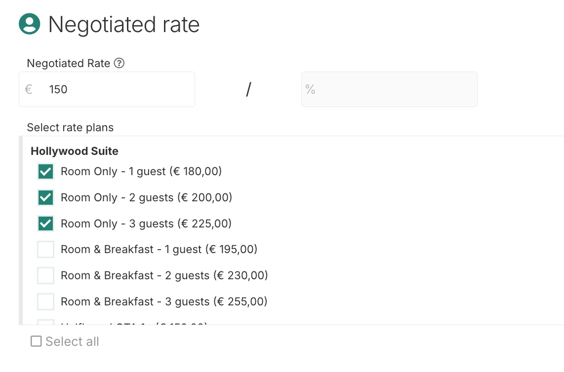 A negotiated rate is a custom discount tied to a guest or booker profile. It can be either: