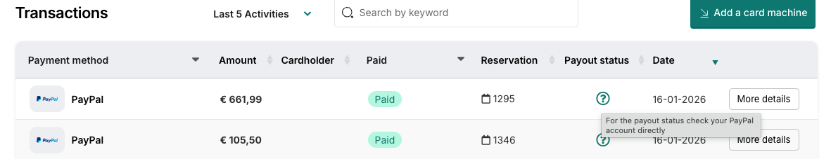 Because PayPal manages its own payouts, you’ll see a question mark icon under payout status. Hovering over it will remind you to check payout details directly in your PayPal account.