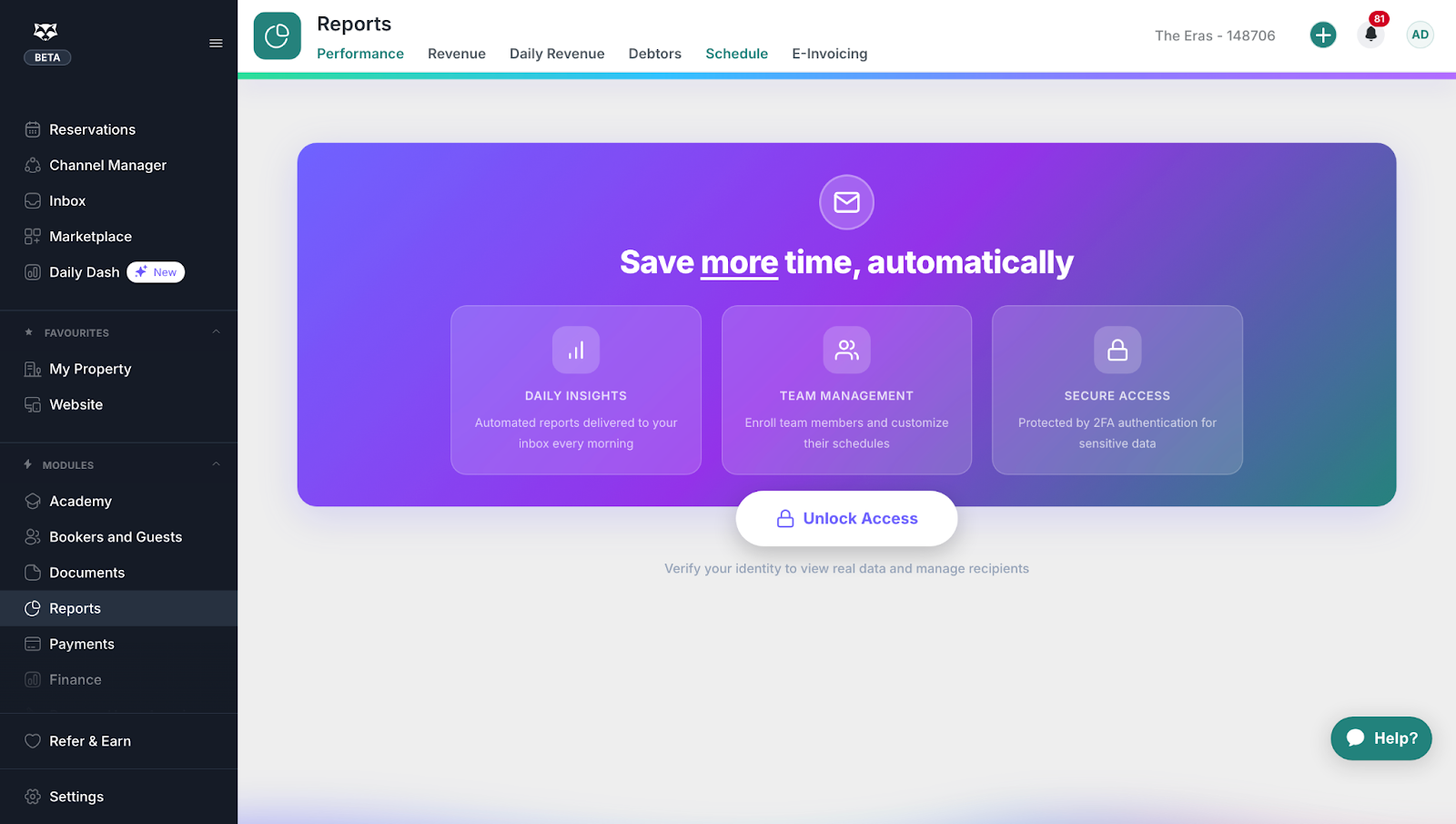 Navigate to the Reports module in RoomRaccoon and open the Schedule tab.