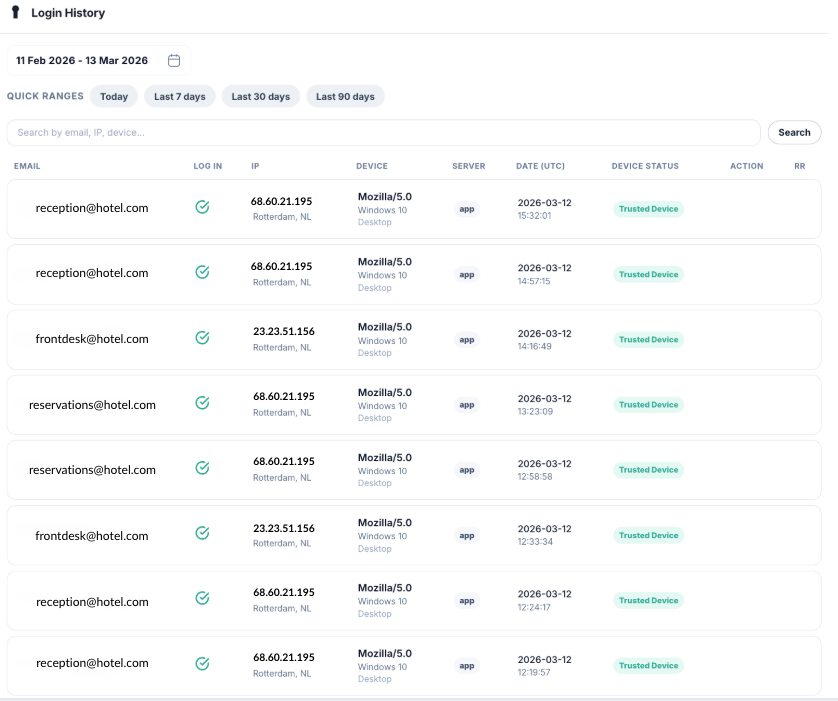The Login History helps you monitor access to your RoomRaccoon account. It provides a detailed overview of all login attempts so you can quickly identify login issues or detect unusual activity.