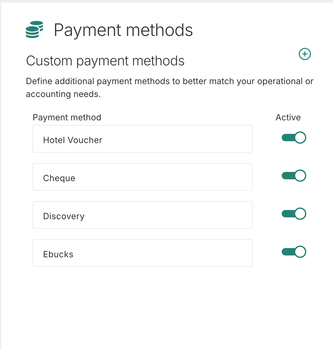 If you would like to activate or deactivate a custom payment method, you can do so using the Active toggle.
