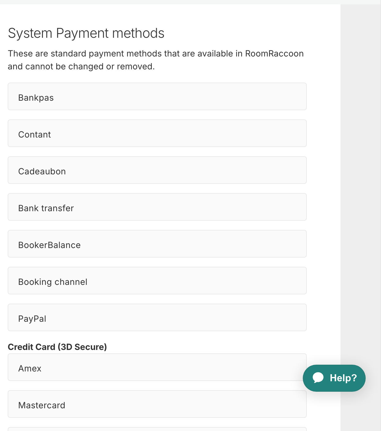 On the right-hand side, you will see the system payment methods. These are standard RoomRaccoon payment methods and cannot be edited or archived.