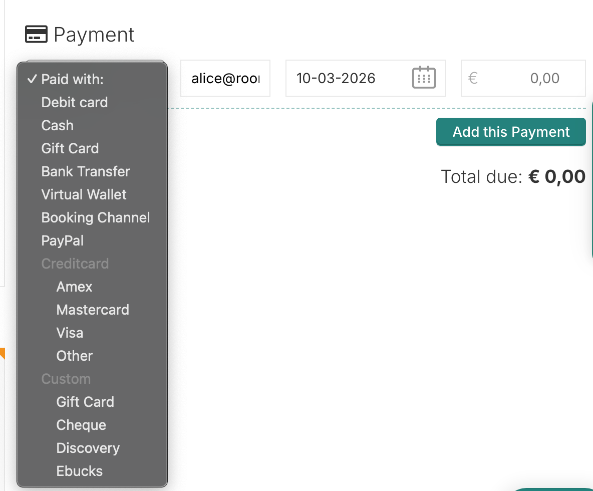 Custom payment methods will appear as an option in the “Paid with” dropdown when recording payments on reservations.