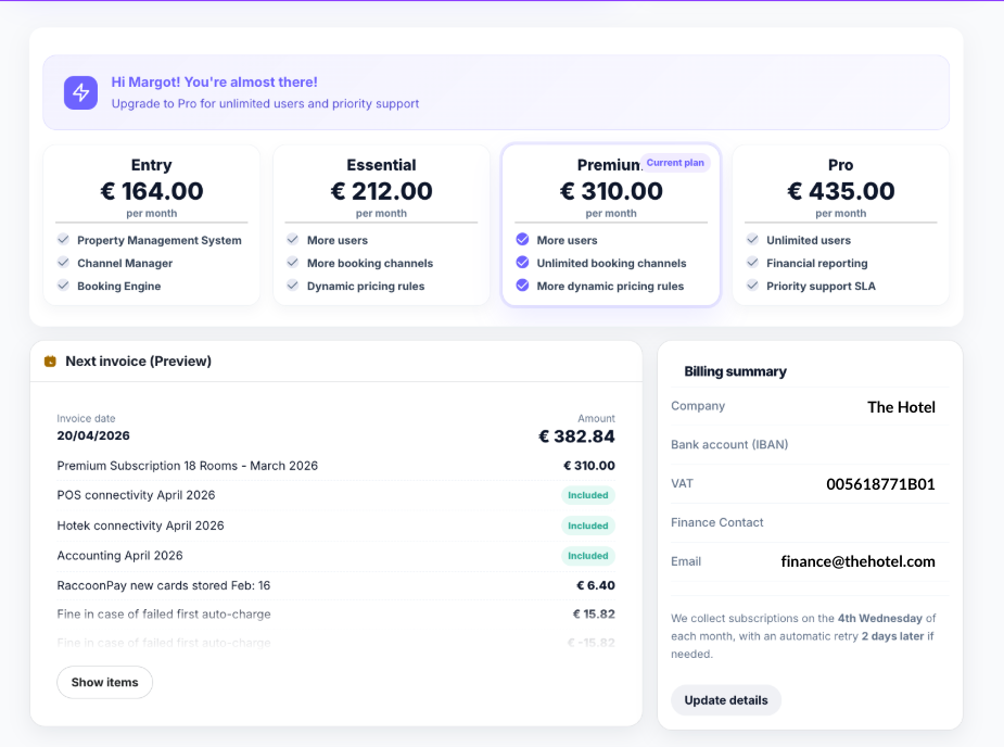 The Subscription Plan page in RoomRaccoon gives you full visibility and control over your plan, payment details, invoices, and upcoming renewals.