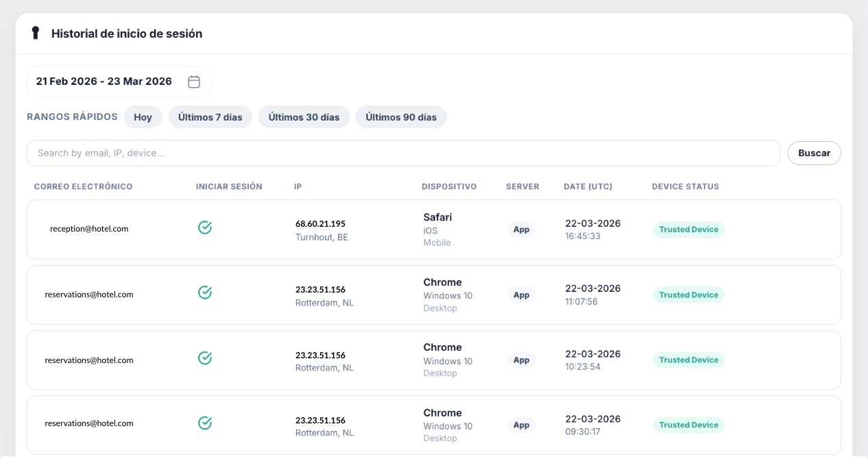 El Historial de inicio de sesión te permite supervisar el acceso a tu cuenta con un registro detallado de todos los intentos de login.