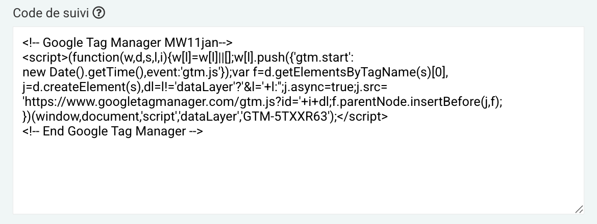 Collez ici vos scripts de suivi (par exemple, Google Tag Manager). Nous recommandons fortement d’utiliser Google Tag Manager (GTM), qui vous permet également d’ajouter d’autres outils de suivi, comme les pixels Meta. En savoir plus sur GTM ? Cliquez ici.