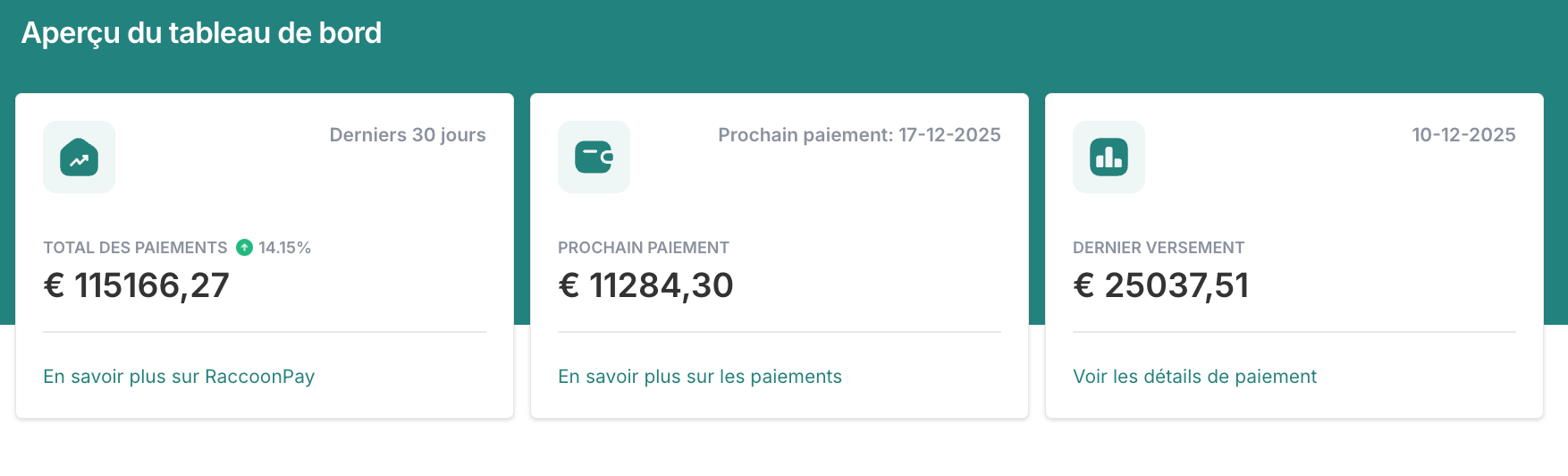 Dans le tableau de bord RaccoonPay, vous trouverez toutes les informations relatives aux versements dans la carte Dernier Versement.