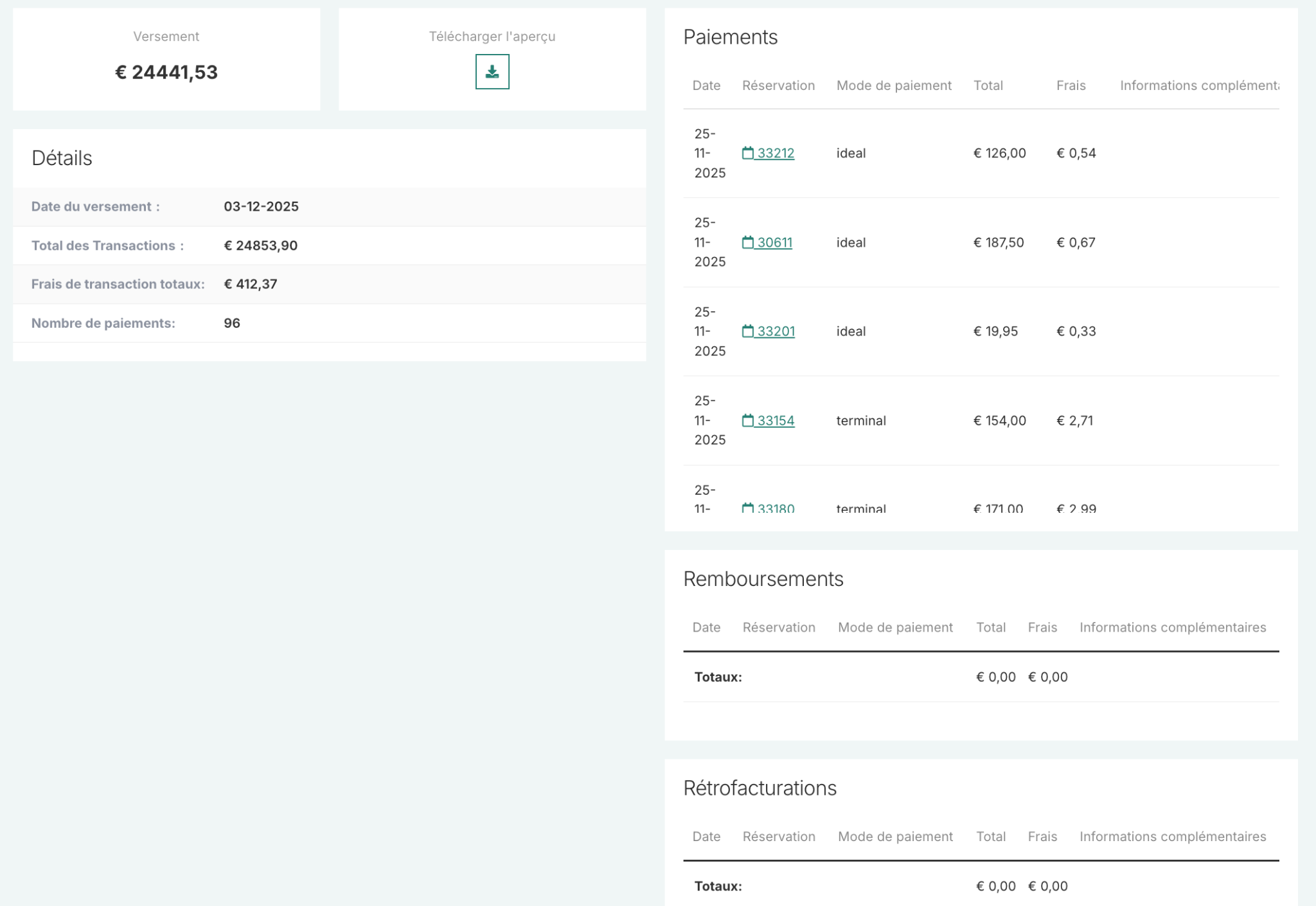 • Informations complémentaires: Permet d’ouvrir les détails du versement : réservations incluses, remboursements, rétrofacturations, etc.