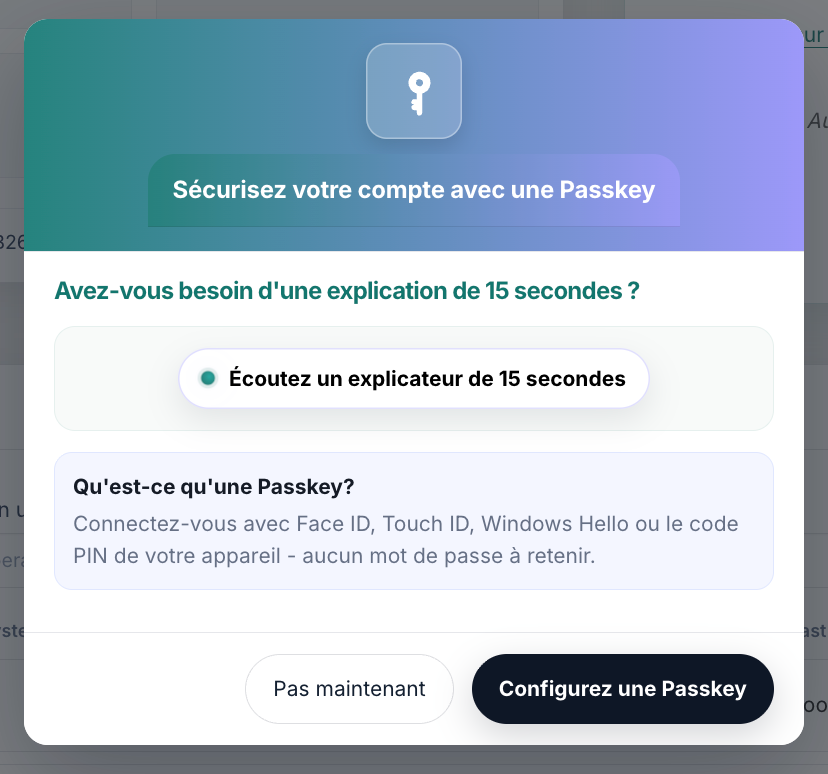 Remarque : Les Passkeys sont compatibles avec la plupart des navigateurs et appareils récents. Pour une expérience optimale, utilisez la dernière version de Chrome, Safari ou Edge.