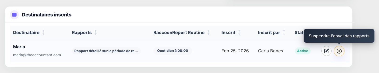 Vous avez également la possibilité de suspendre temporairement les envois si un utilisateur est en congé ou n’a plus besoin de recevoir les rapports.