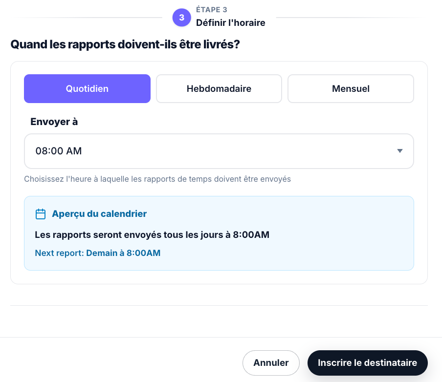 Définir la planification : Sélectionnez la fréquence (quotidienne, hebdomadaire ou mensuelle) ainsi que l’heure d’envoi souhaitée.