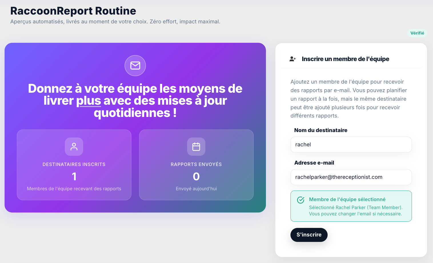 Une fois la vérification effectuée, vous serez redirigé vers le tableau de bord RaccoonReport Routine, depuis lequel vous pouvez :