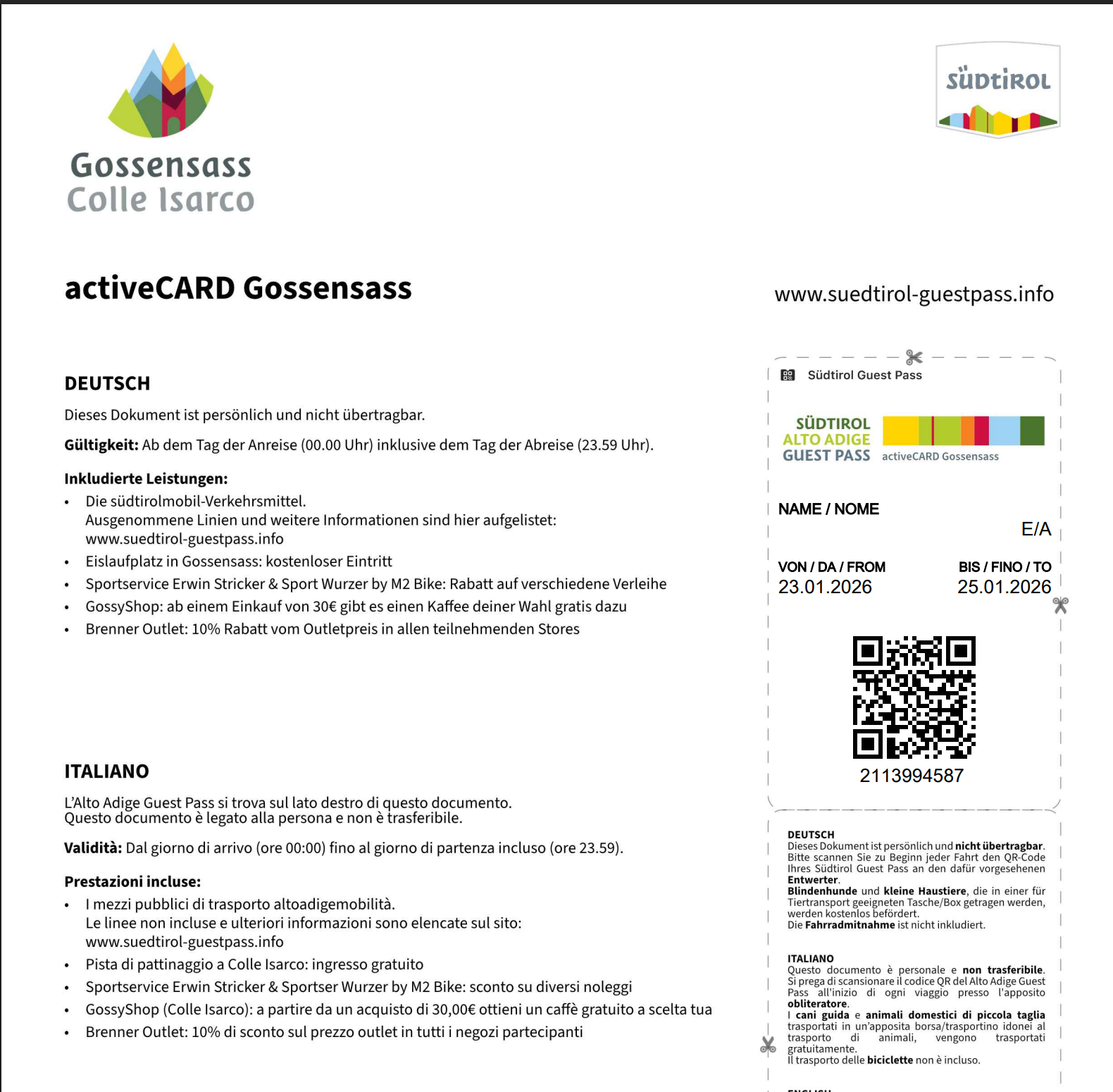 il pass viene recapitato all’indirizzo e-mail dell’ospite