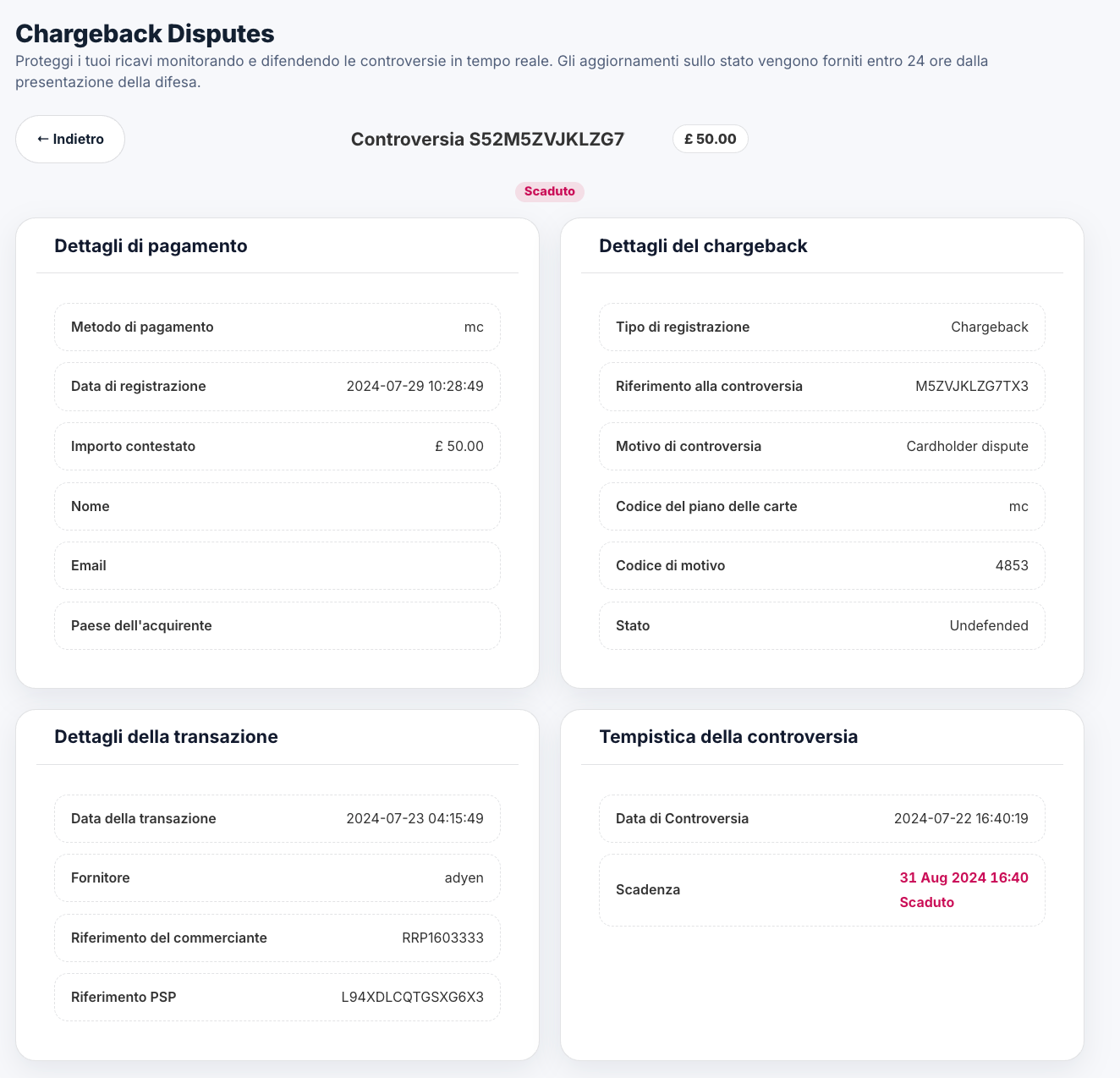 La schermata principale mostra l’elenco di tutte le contestazioni e notifiche di frode. Per ogni caso sono visibili: