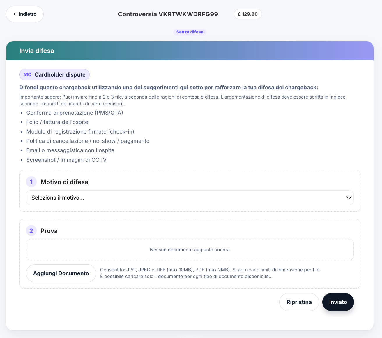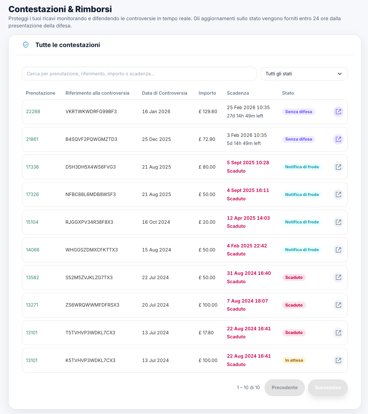 La dashboard Rimborsi & Contestazioni ti consente di monitorare, gestire e difendere le contestazioni di pagamento direttamente dal tuo account RoomRaccoon. Offre un punto centrale per visualizzare tutte le contestazioni e le notifiche di frode e ti permette di caricare autonomamente le prove di difesa, senza dover dipendere da supporto esterno.
