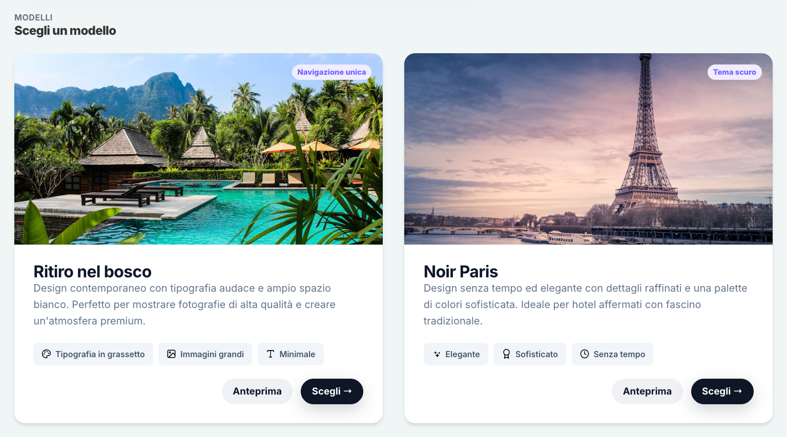 Griglia servizi: Evidenzia i servizi della tua struttura—come Wi-Fi, parcheggio, colazione o spa—in modo chiaro e visivo.