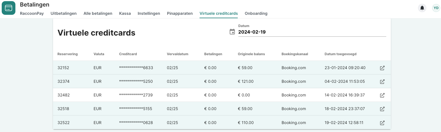Je boekingskanalen (bijv. Booking.com, Expedia, etc) moeten de VCC-gegevens opnemen in de reserveringsgegevens die ze naar RoomRaccoon sturen. Als dit nog niet gebeurt, neem dan direct contact op met het boekingskanaal en vraag hiernaar.