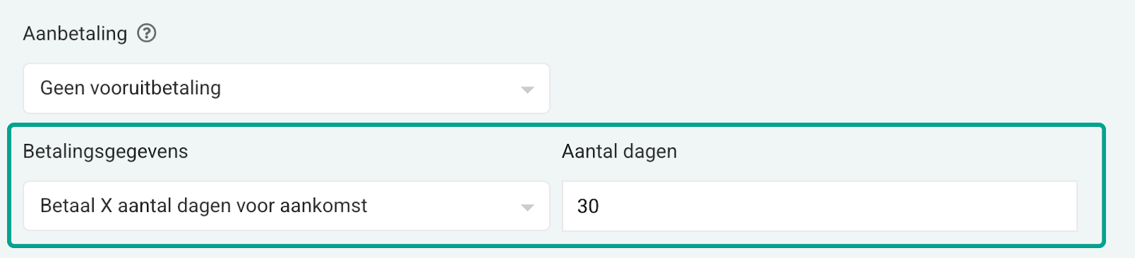 “Vooruitbetaling X dagen voor aankomst aanrekenen”Vul het aantal dagen in (max 255)