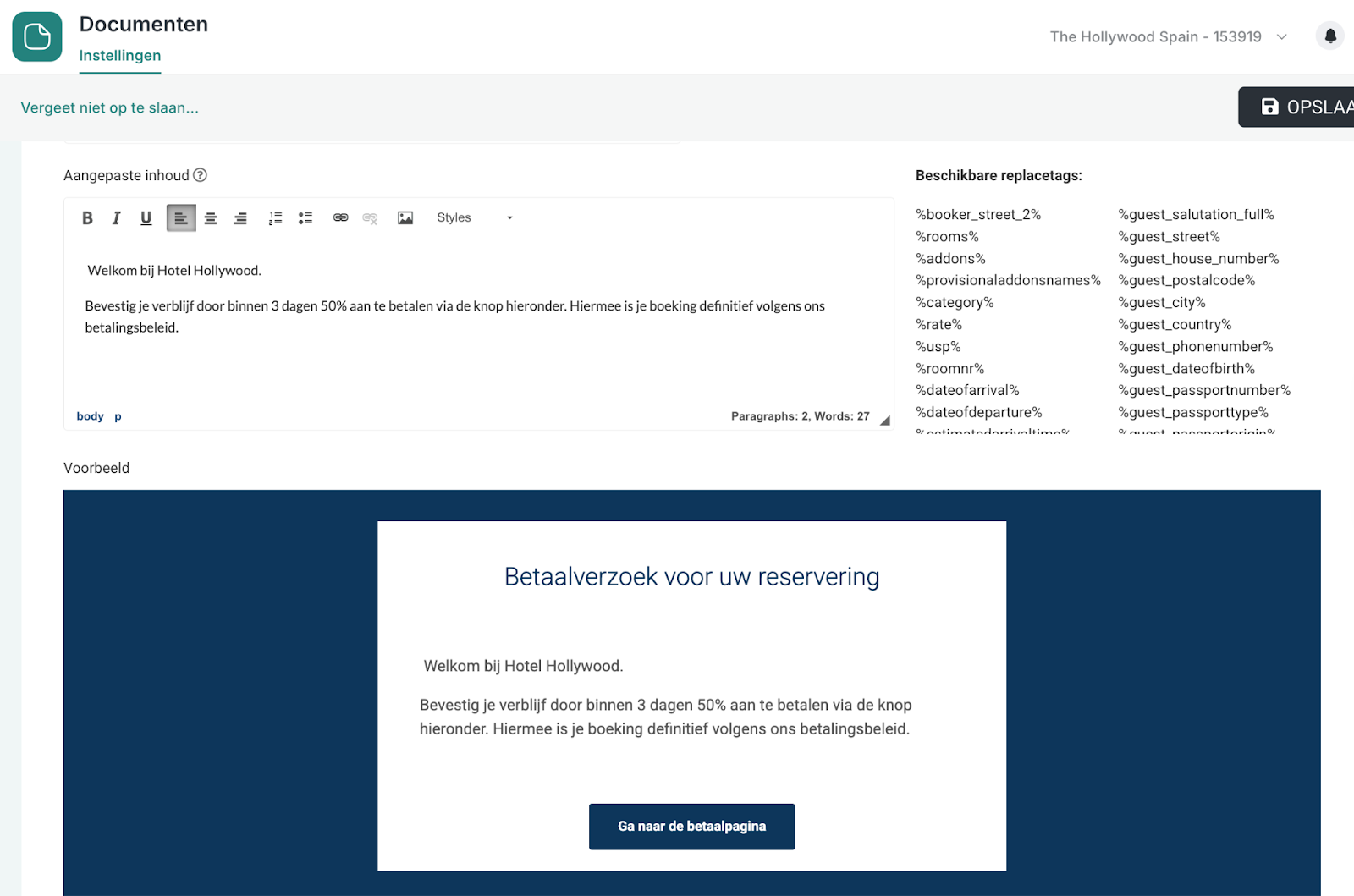 “Welkom bij [Hotelnaam]! Bevestig je verblijf door binnen 3 dagen 50% aan te betalen via de knop hieronder. Hiermee is je boeking definitief volgens ons betalingsbeleid.”