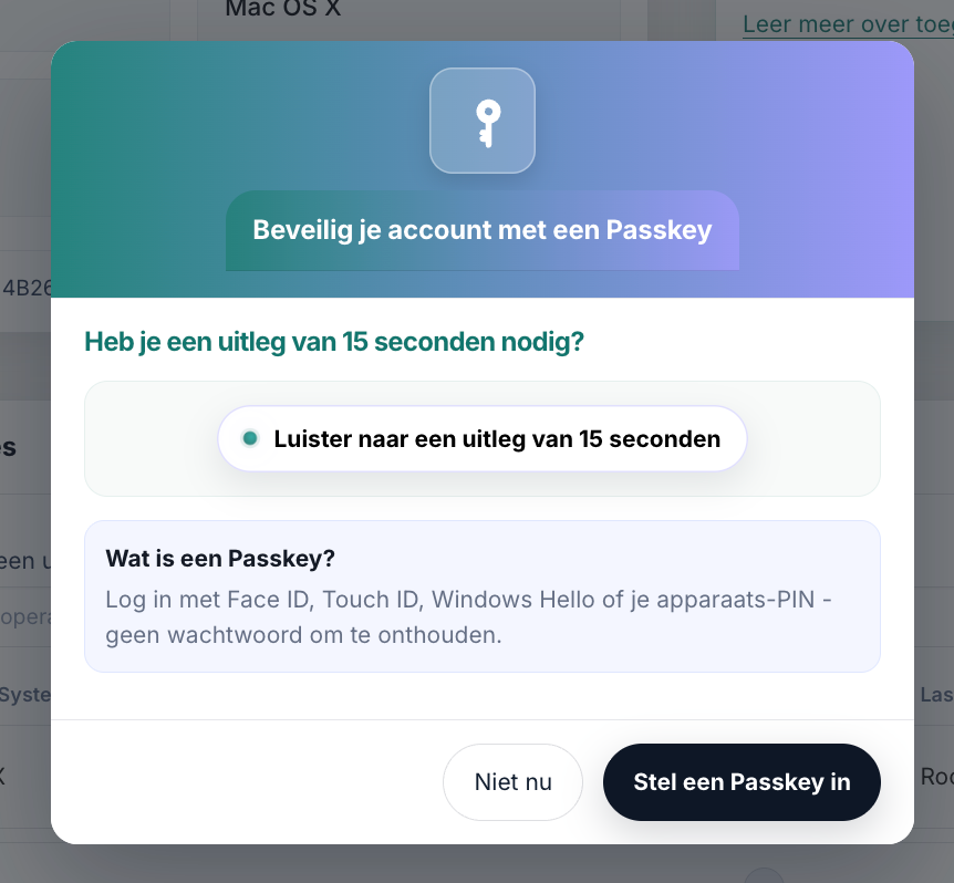 Let op: Passkeys worden ondersteund door de meeste moderne browsers en apparaten. Voor de beste ervaring gebruik je de nieuwste versie van Chrome, Safari of Edge.