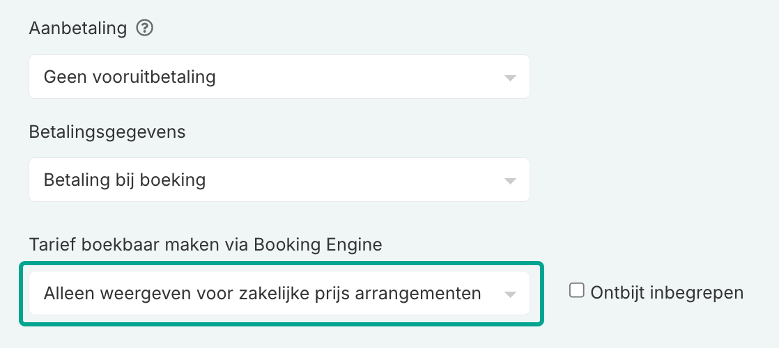 In de ‘Tonen in Booking Engine’ dropdown kies je: Alleen weergeven voor zakelijke prijsarrangementen.