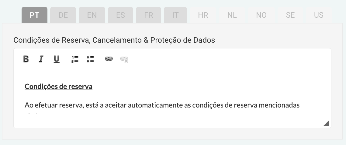 Pode encontrar os termos e condições de reserva no módulo Booking Engine > BE Setup. Desloque-se para baixo até encontrar o campo de texto dos termos de reserva e insira as suas condições personalizadas. Por favor, note: