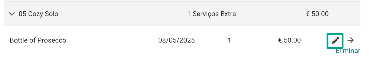 Transferências dentro de reservas de grupo exigem um fluxo diferente. Se estiver a tentar mover um complemento entre quartos dentro da mesma reserva de grupo, o ícone de seta não estará ativo. Em vez disso, utilize o ícone de lápis (editar) para reatribuir o quarto e o hóspede dentro do grupo (consulte a secção “Exceção para Reservas de Grupo” abaixo para todos os passos).