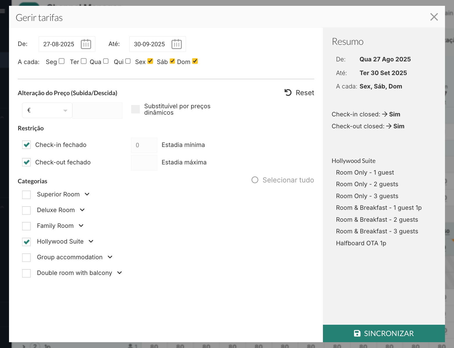 Selecione os tipos de tarifa a encerrar, reveja o resumo e clique em Sincronizar.