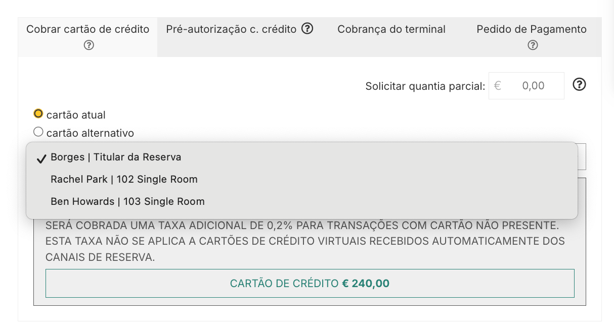 Isto é ideal para reservas de grupo ou com vários quartos, onde cada hóspede pode preferir utilizar o seu próprio cartão. Todos os cartões são armazenados de forma encriptada através do seu fornecedor de pagamentos, permitindo-lhe efetuar cobranças de forma rápida, segura e precisa.