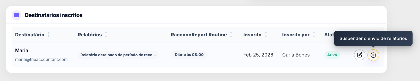 Pode editar destinatários existentes e atualizar as preferências a qualquer momento. Também pode suspender temporariamente os relatórios se um utilizador estiver de licença ou já não precisar de os receber.