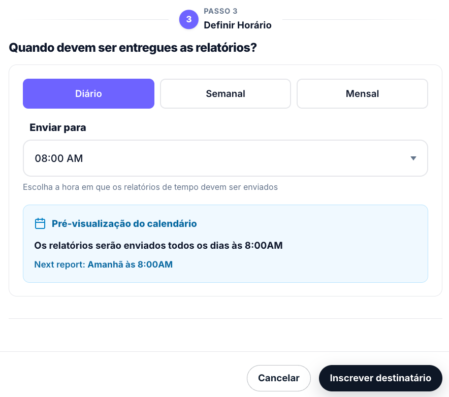 Selecionar o agendamento: escolha a frequência (diária, semanal ou mensal) e a hora de envio preferida.