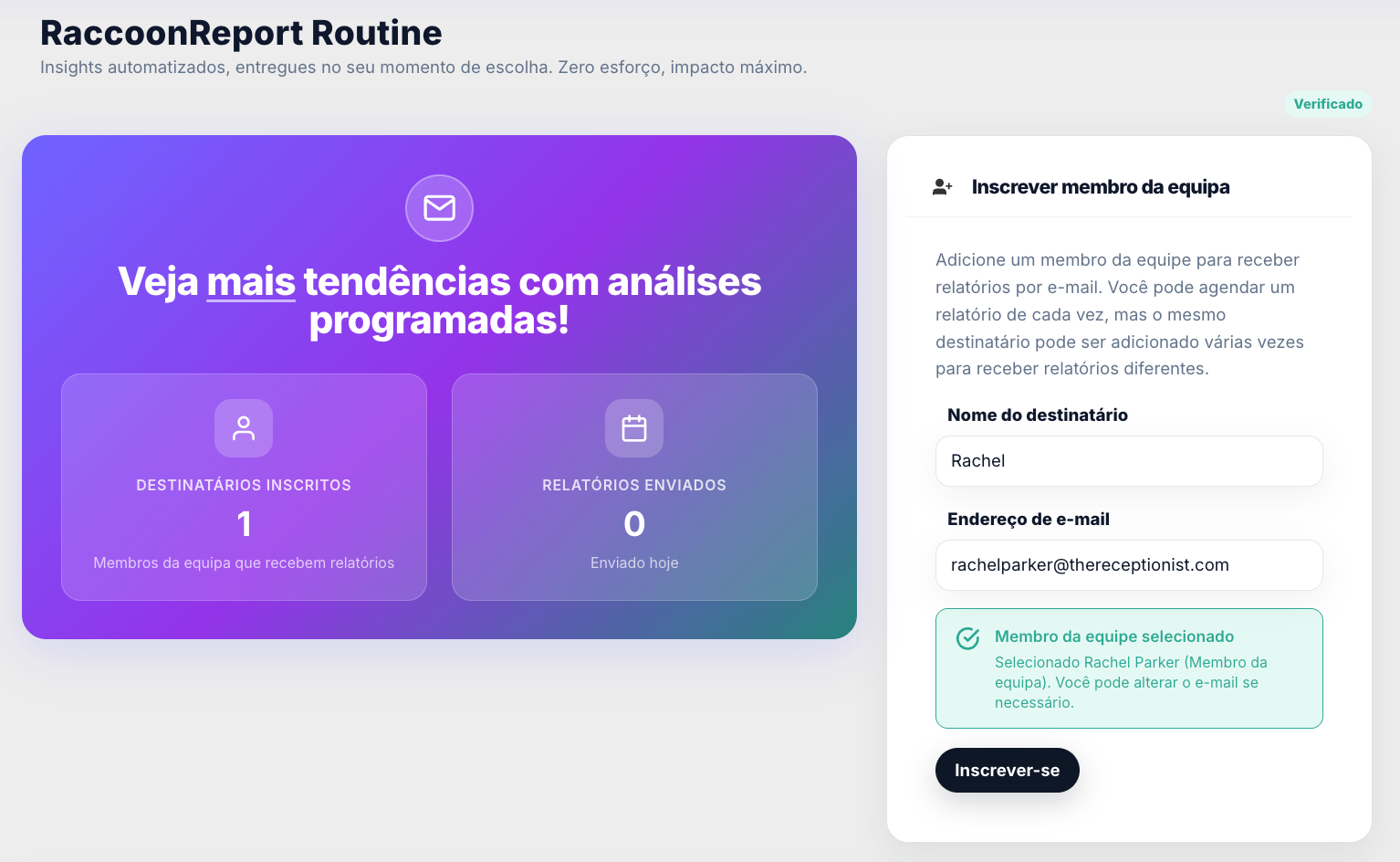 Depois de validado, será redirecionado para o Dashboard RaccoonReport Routine, onde pode: