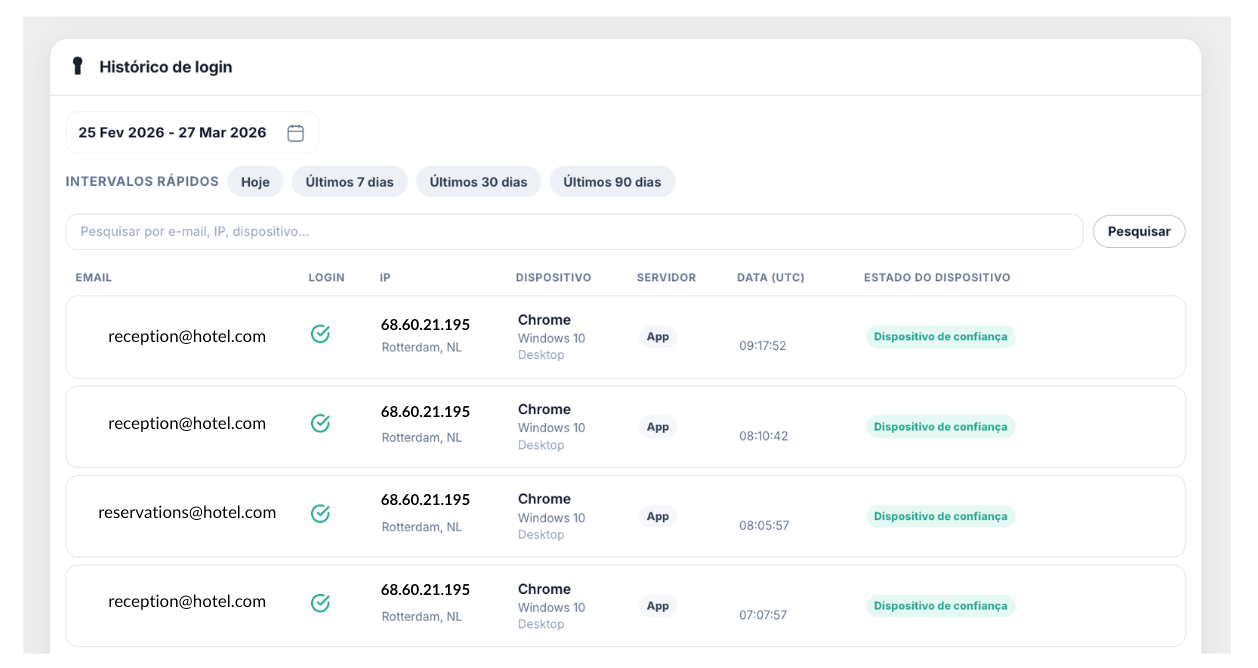Histórico de Inícios de Sessão permite-lhe monitorizar o acesso à sua conta RoomRaccoon. Disponibiliza uma visão detalhada de todas as tentativas de início de sessão, para que possa identificar rapidamente problemas de acesso ou detetar atividade invulgar.