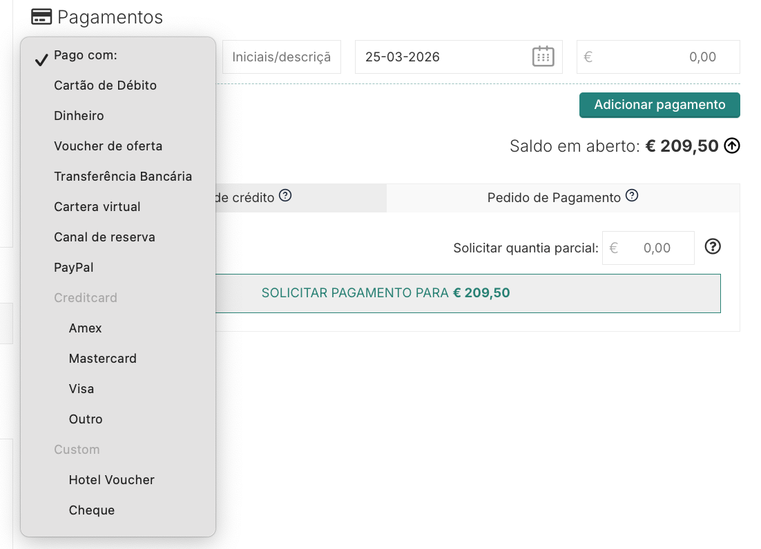 Os métodos de pagamento personalizados aparecerão como opção no menu suspenso “Pago com” ao registar pagamentos em reservas.