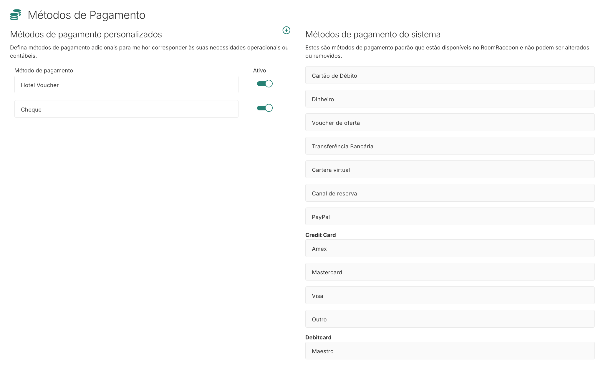 No lado direito, encontrará os métodos de pagamento do sistema. Estes são métodos padrão do RoomRaccoon e não podem ser editados nem arquivados.